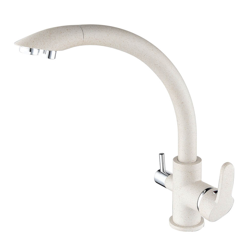 Comparing to normal faucets, the 3 way taps is equipped with two separate internal channel , the main chanel is still used as usual for mixer faucet water which is kept the desired temperature via a ceramic mixer valve in the faucet, there is war4m and cold water connection, in the second channel, on the other handle, the filter water flow, this is connected directly to OS and therefore the two channel's water do not contact for each other, the three way faucet with two separate levers for pured water and mixer water. and the three way faucets is connected via two flexible hose and pured water hose or quickly adapter.the two flexible hoses (normally blue and red marked ) conected to hot and cold water , the pured water hose or quickly adapter is connected to the osmosis system. The faucet can replace your older faucet by its hole, it is easy to replace and conviently for working