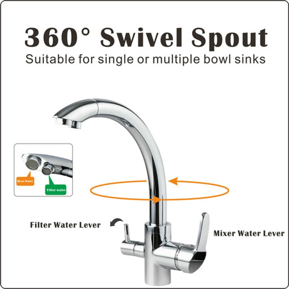 The DOGO modern 3 way faucet, high curved and classic design, in connection with osmosis water system , is a perfect solution for your kictchen water, the faucet is made from chrome-plated brass and is anti -rust and pollution free. the water was controlled by two lever when flow through faucet, the small lever is used for filter water which connected to OS water system by purified water hose. with which you can tap on or off freshly fitered osmosis water from RO water system at any time.
