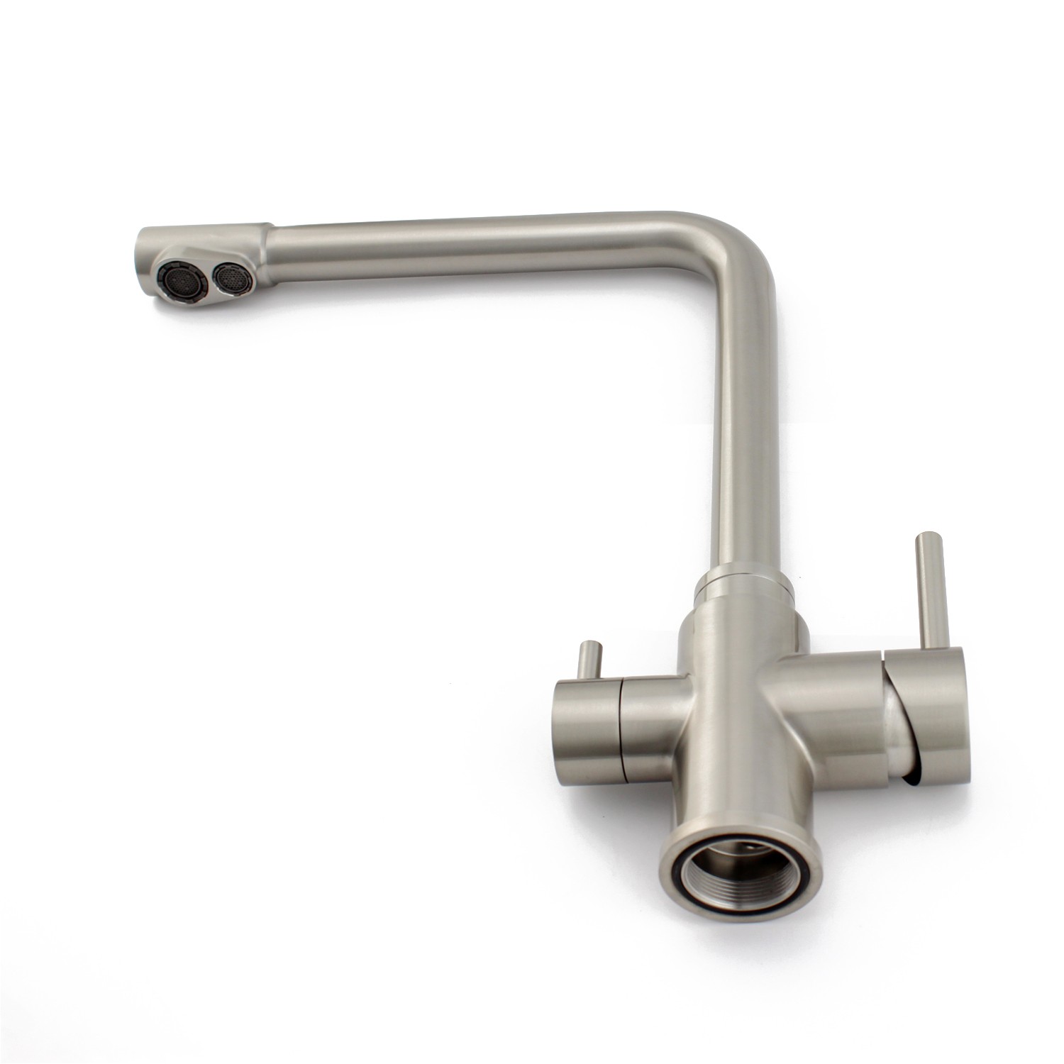 The DOGO modern 3 way faucet, high curved and classic design, in connection with osmosis water system , is a perfect solution for your kictchen water, the faucet is made from chrome-plated brass and is anti -rust and pollution free. the water was controlled by two lever when flow through faucet, the small lever is used for filter water which connected to OS water system by purified water hose. with which you can tap on or off freshly fitered osmosis water from RO water system at any time.