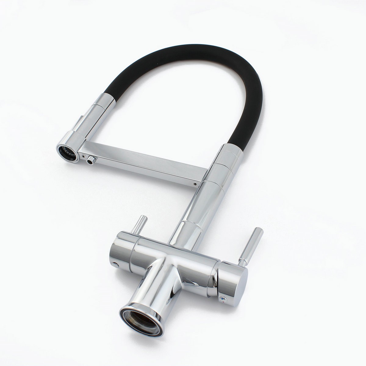 The DOGO modern 3 way faucet, high curved and classic design, in connection with osmosis water system , is a perfect solution for your kictchen water, the faucet is made from chrome-plated brass and is anti -rust and pollution free. the water was controlled by two lever when flow through faucet, the small lever is used for filter water which connected to OS water system by purified water hose. with which you can tap on or off freshly fitered osmosis water from RO water system at any time.