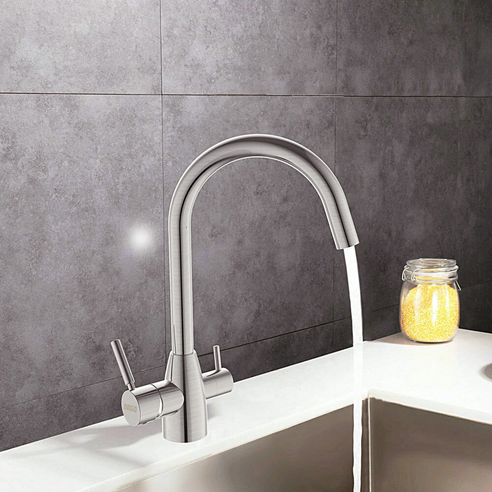 The DOGO modern stainless steel 3 way kitchen faucet, high curved and classic design, in connection with osmosis water system , is a perfect solution for your kictchen water, the faucet is made from chrome-plated brass and is anti -rust and pollution free. the water was controlled by two lever when flow through faucet, the small lever is used for filter water which connected to OS water system by purified water hose. with which you can tap on or off freshly fitered osmosis water from RO water system at any time.