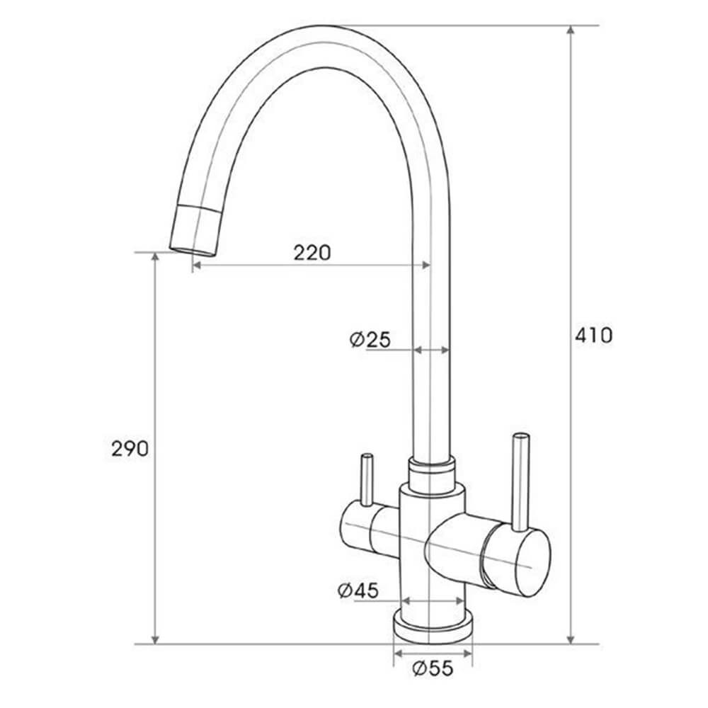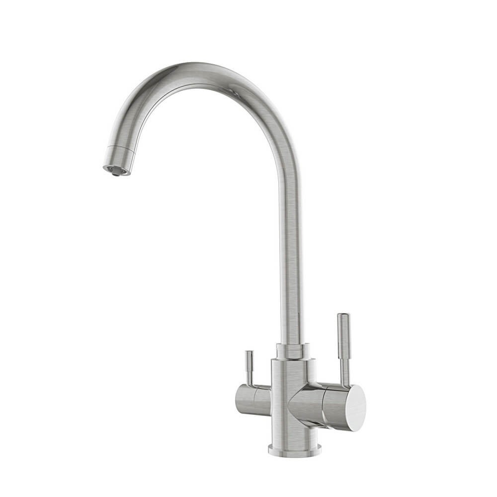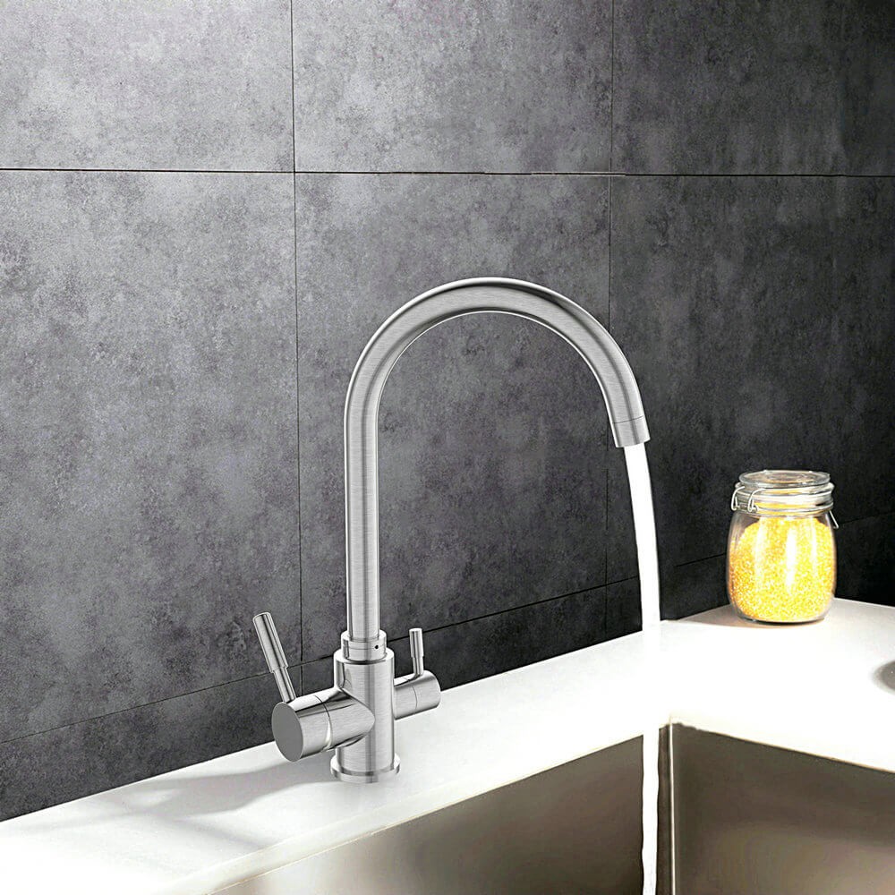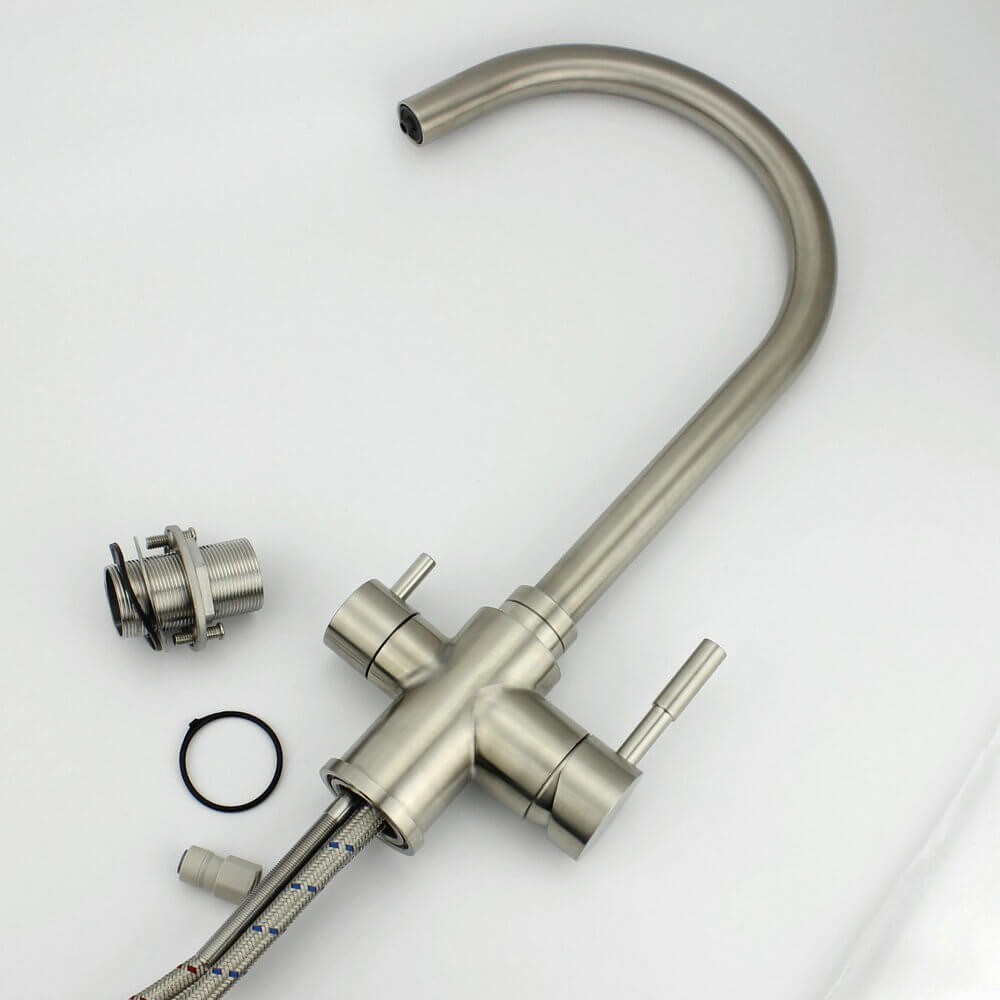 The DOGO modern stainless steel 3 way kitchen faucet, high curved and classic design, in connection with osmosis water system , is a perfect solution for your kictchen water, the faucet is made from chrome-plated brass and is anti -rust and pollution free. the water was controlled by two lever when flow through faucet, the small lever is used for filter water which connected to OS water system by purified water hose. with which you can tap on or off freshly fitered osmosis water from RO water system at any time.